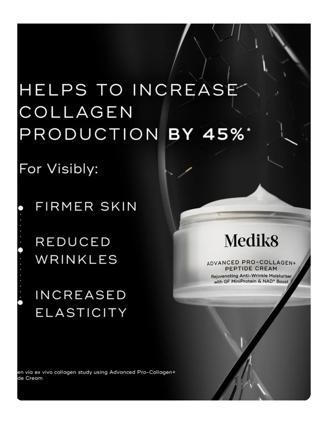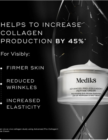 Medik8 Advanced Pro-Collagen+ Peptide Cream — najbardziej zaawansowana innowacja kolagenowa, stworzona, by odbudować fundamenty Twojej skóry i przywrócić jej młodzieńczą sprężystość. Formuła z Growth Factor MiniProtein™ precyzyjnie aktywuje komórki odpowiedzialne za produkcję kolagenu, zapewniając skórze widoczną jędrność, elastyczność i optymalne nawilżenie. Klinicznie potwierdzono, że krem zwiększa naturalną produkcję kolagenu o 45%, a już po 7 dniach stosowania skóra wygląda na gładszą, bardziej napiętą i wyraźnie odmłodzoną.