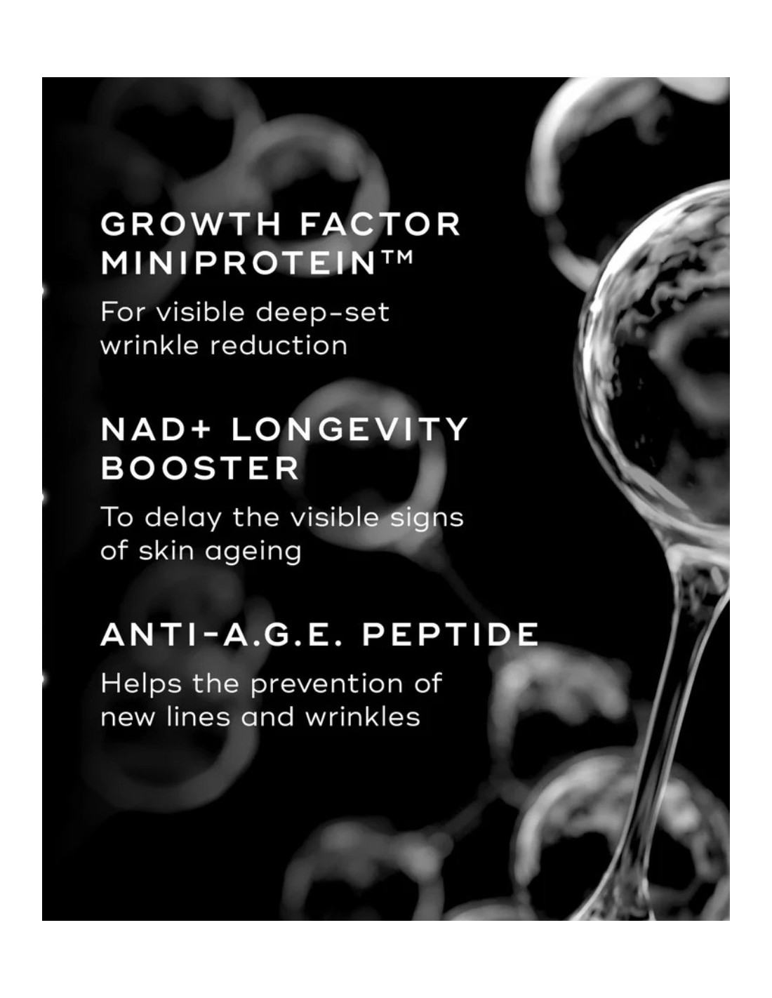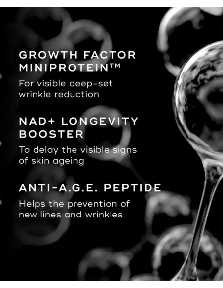 - Growth Factor MiniProtein™ - Zaawansowany czynnik wzrostu, który widocznie poprawia strukturę skóry, zwiększając poziom kolagenu, elastyny i kwasu hialuronowego - Efekt to jędrniejsza, bardziej sprężysta i młodzieńczo napięta cera.